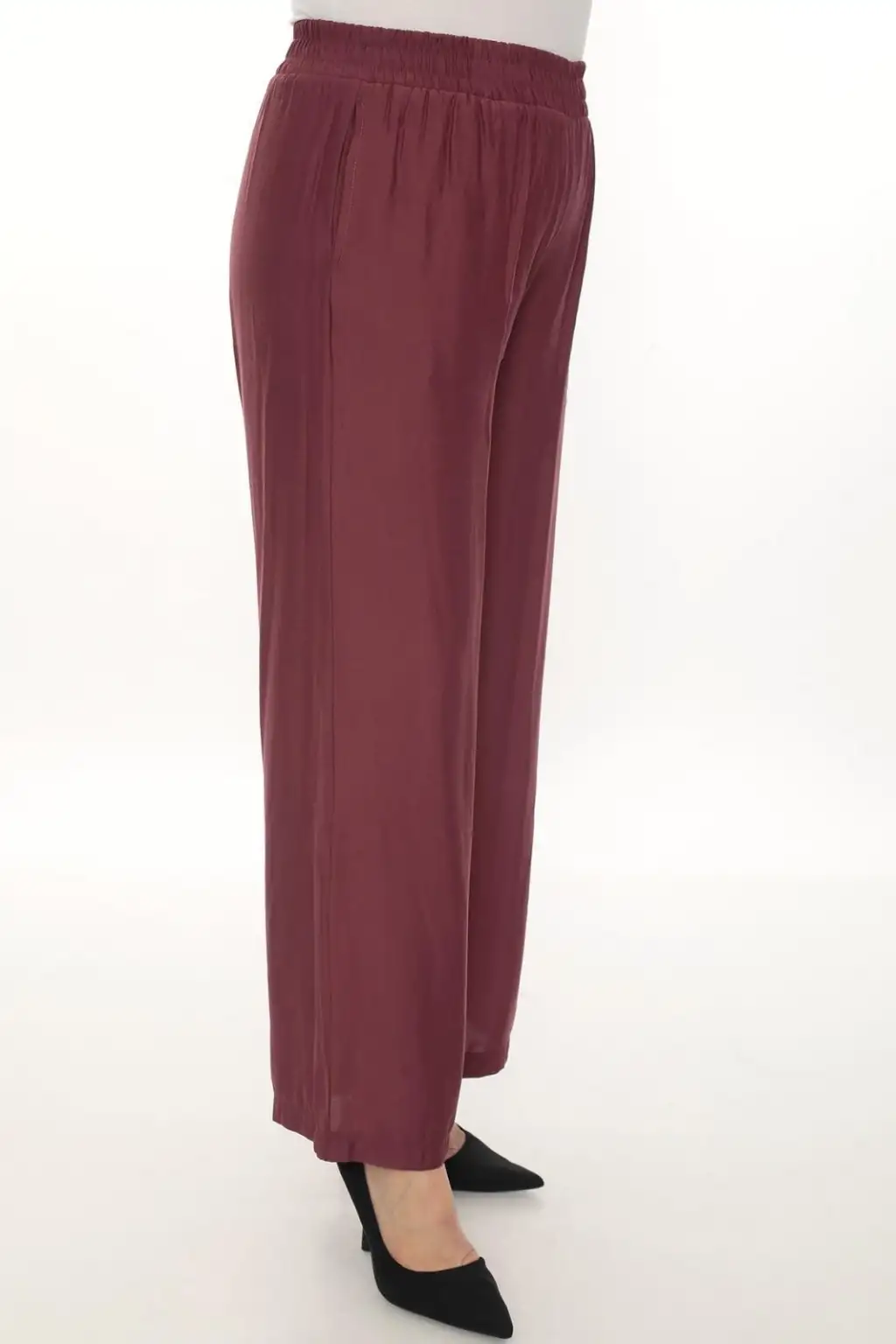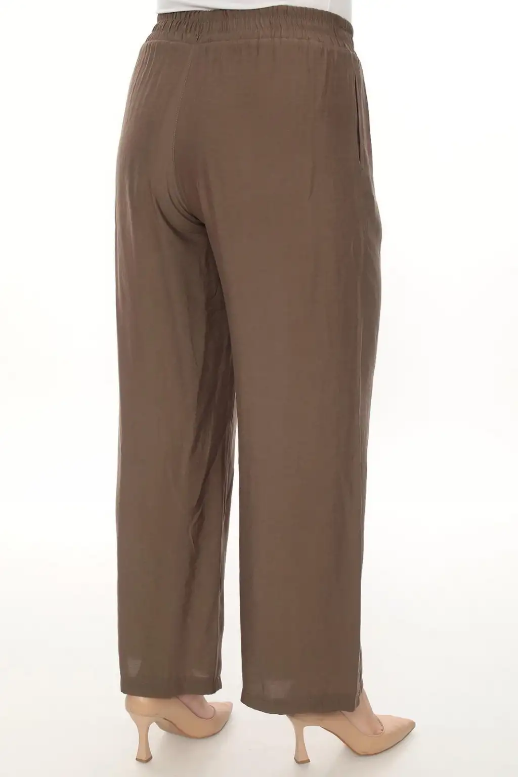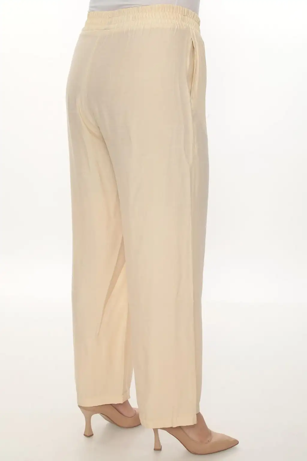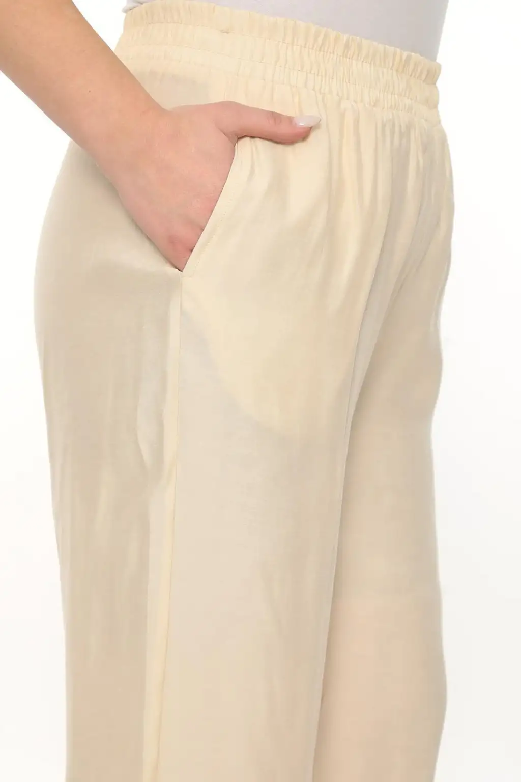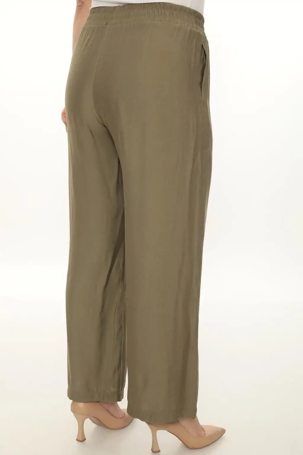 Esnek beli lastikli pantolon yapısı vücuda uyum sağlar ve kolay kullanım sunar. Hafif ve dökümlü kumaşı sayesinde hareket özgürlüğü sağlar. Rahat kesim kadın pantolon modeli; tişört, gömlek, tunik ve bluzlarla kolayca kombinlenebilir.