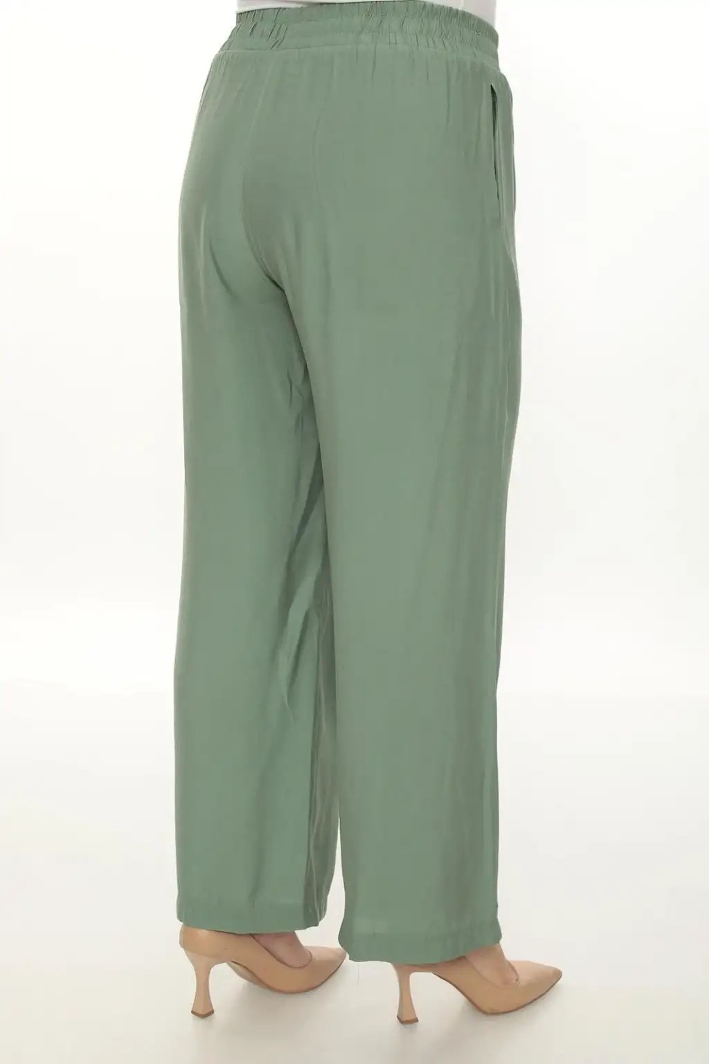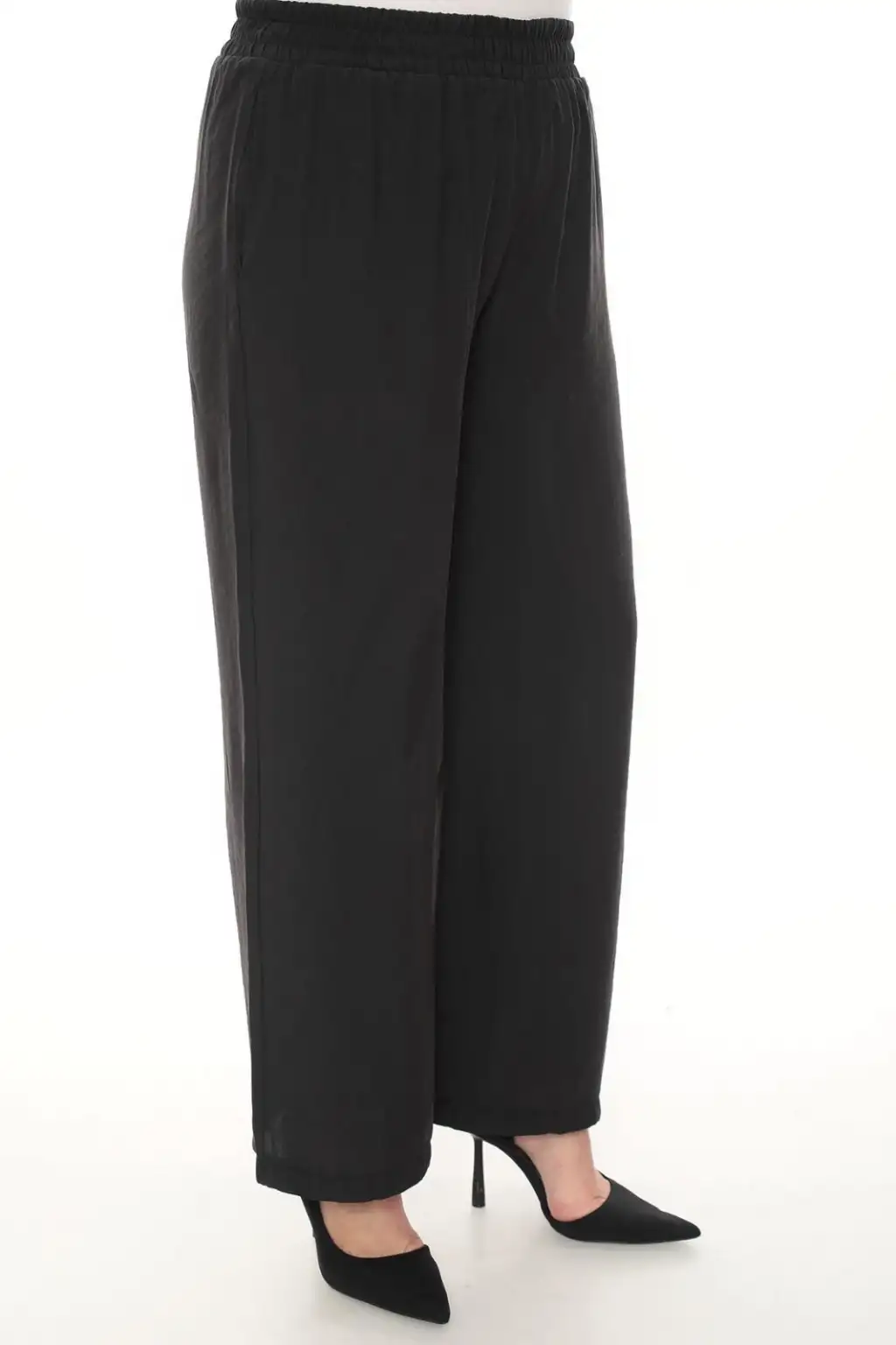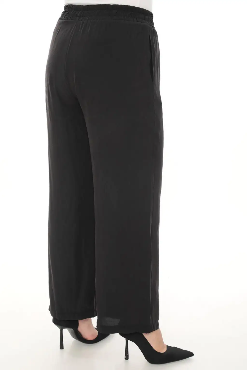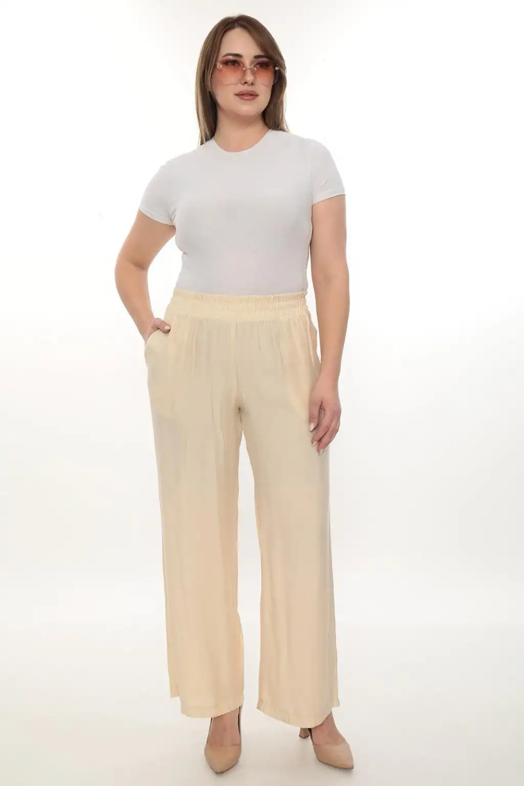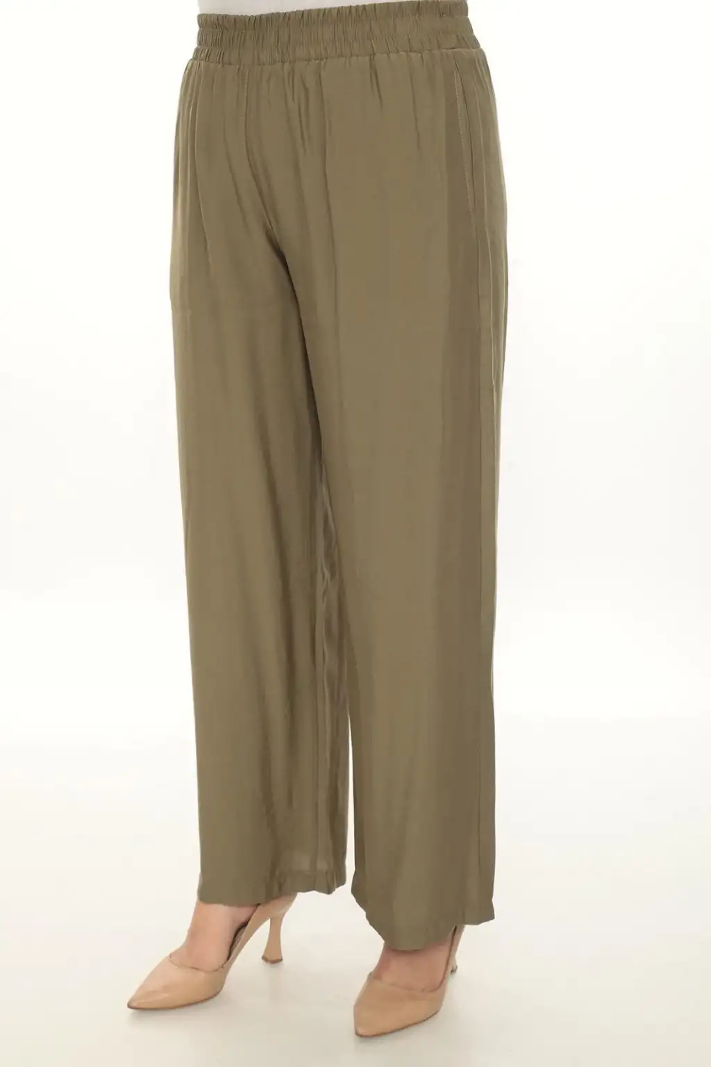 Esnek beli lastikli pantolon yapısı vücuda uyum sağlar ve kolay kullanım sunar. Hafif ve dökümlü kumaşı sayesinde hareket özgürlüğü sağlar. Rahat kesim kadın pantolon modeli; tişört, gömlek, tunik ve bluzlarla kolayca kombinlenebilir.
