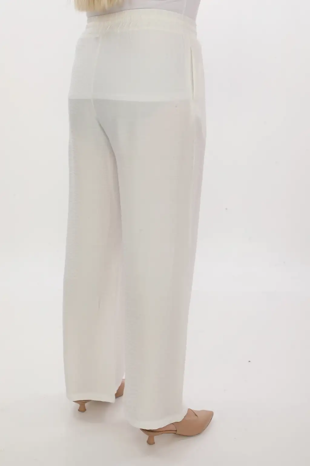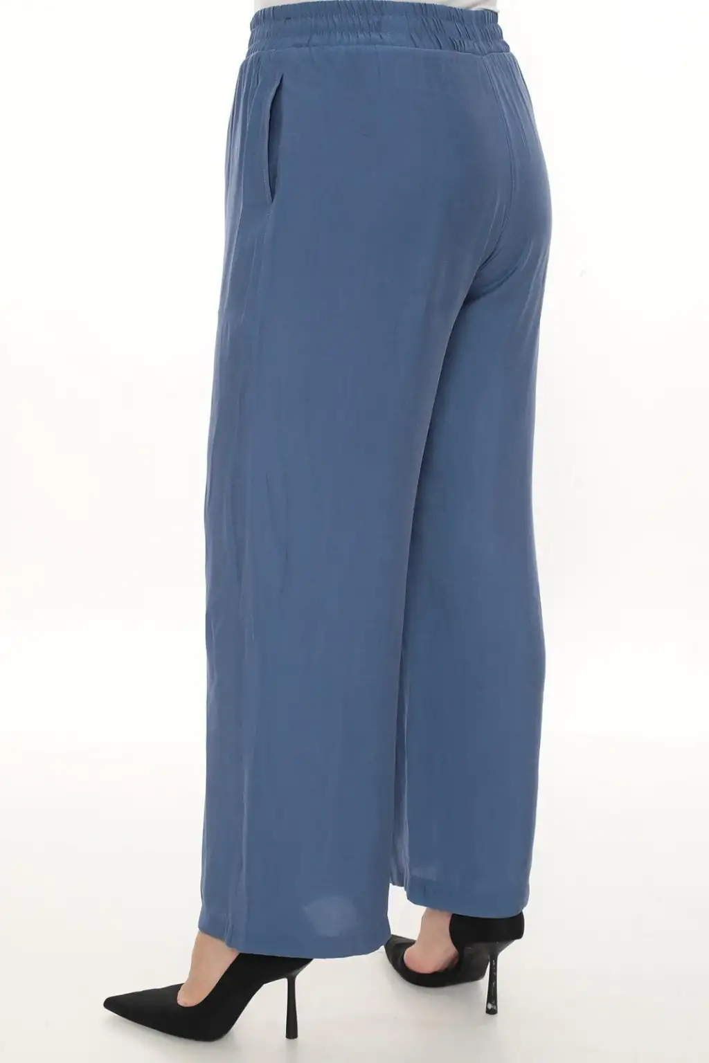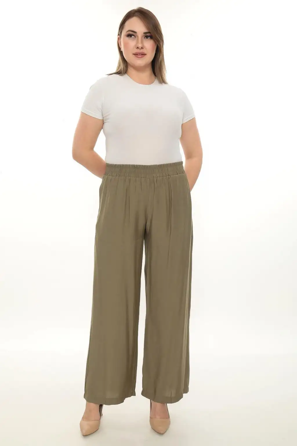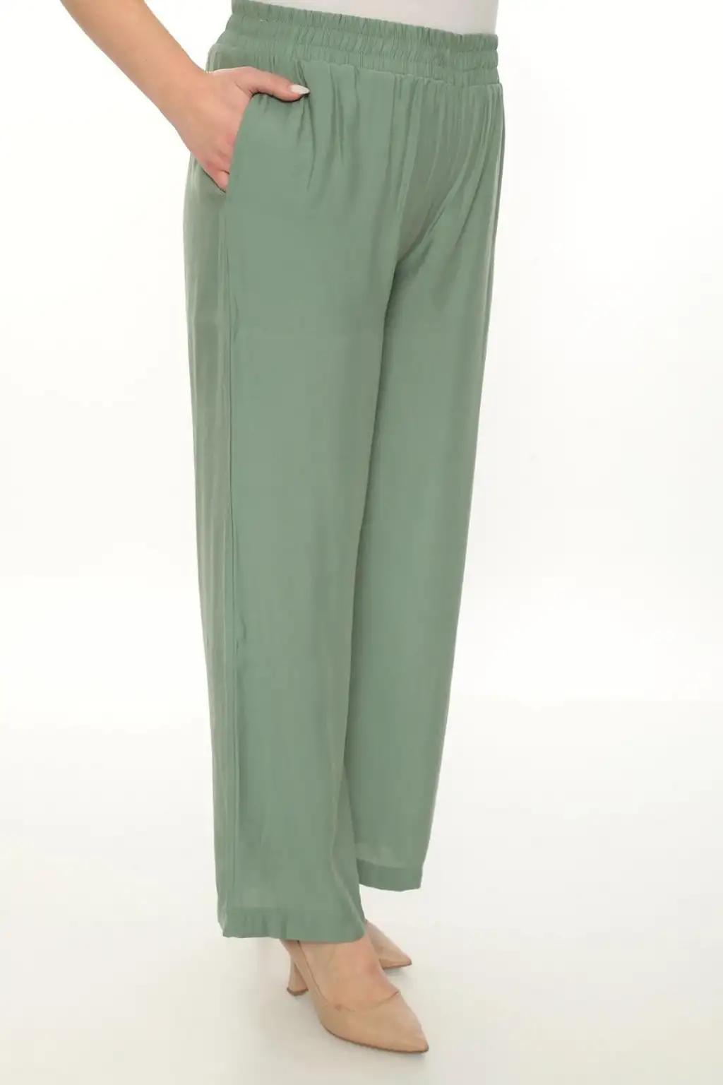 Esnek beli lastikli pantolon yapısı vücuda uyum sağlar ve kolay kullanım sunar. Hafif ve dökümlü kumaşı sayesinde hareket özgürlüğü sağlar. Rahat kesim kadın pantolon modeli; tişört, gömlek, tunik ve bluzlarla kolayca kombinlenebilir.