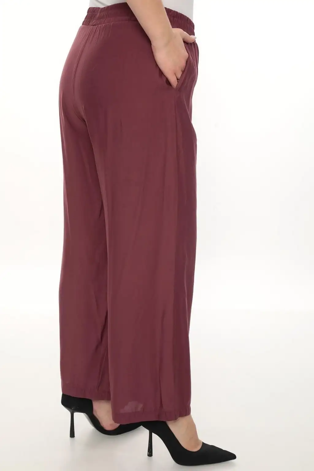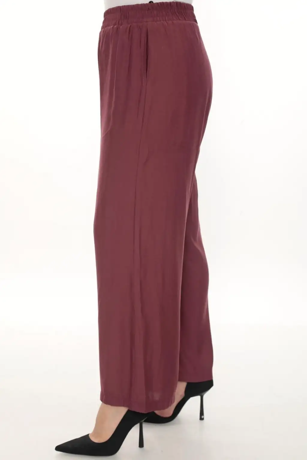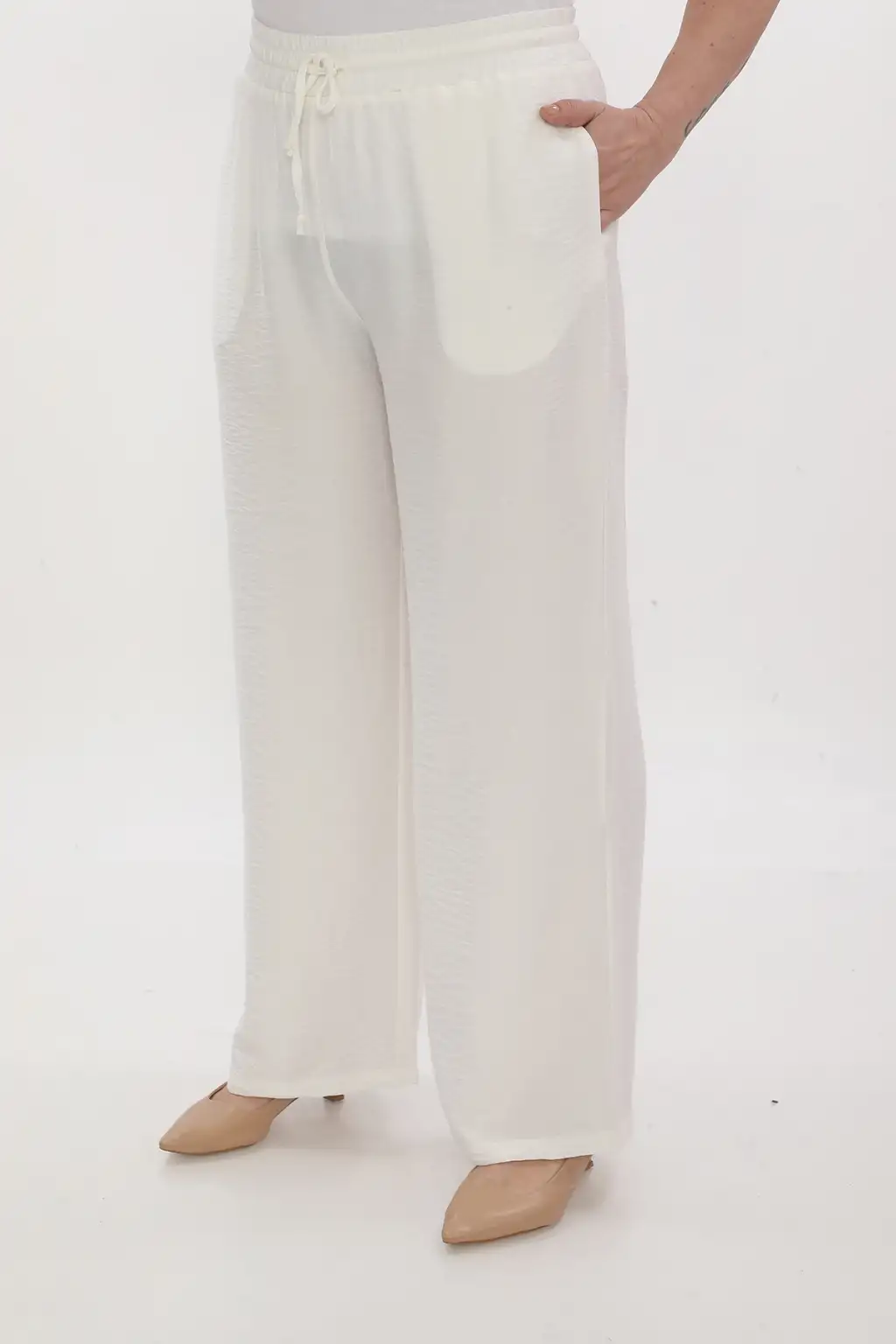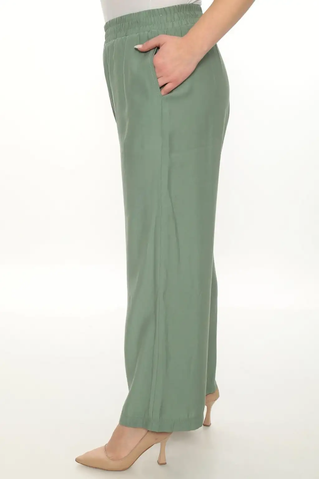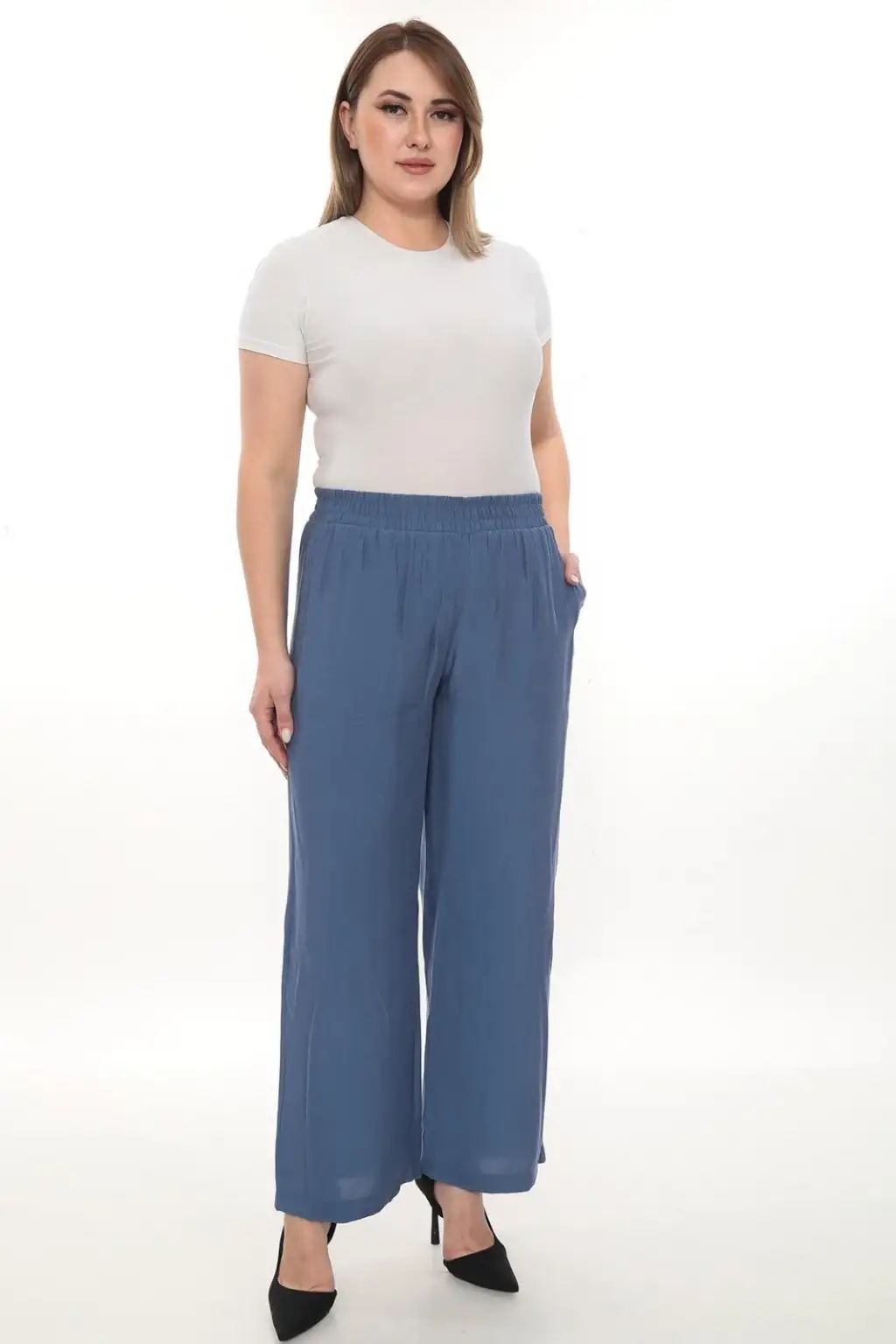 Esnek beli lastikli pantolon yapısı vücuda uyum sağlar ve kolay kullanım sunar. Hafif ve dökümlü kumaşı sayesinde hareket özgürlüğü sağlar. Rahat kesim kadın pantolon modeli; tişört, gömlek, tunik ve bluzlarla kolayca kombinlenebilir.