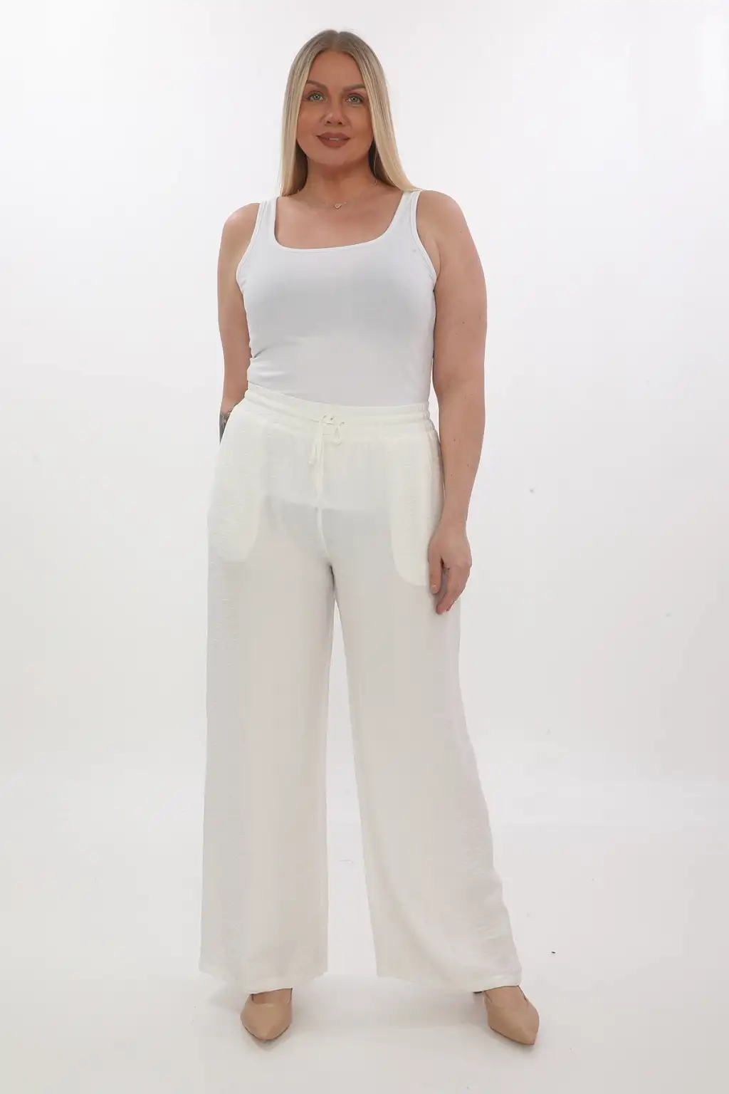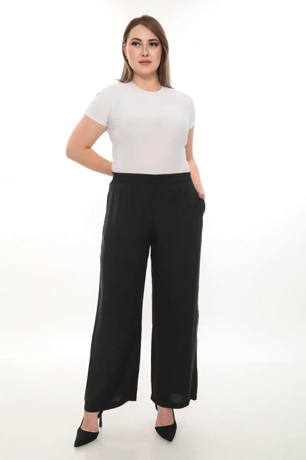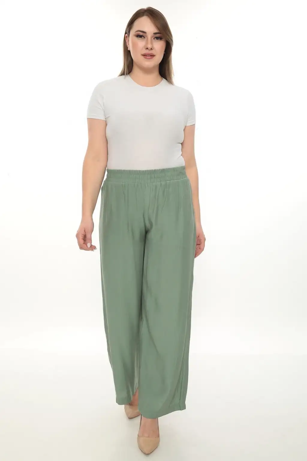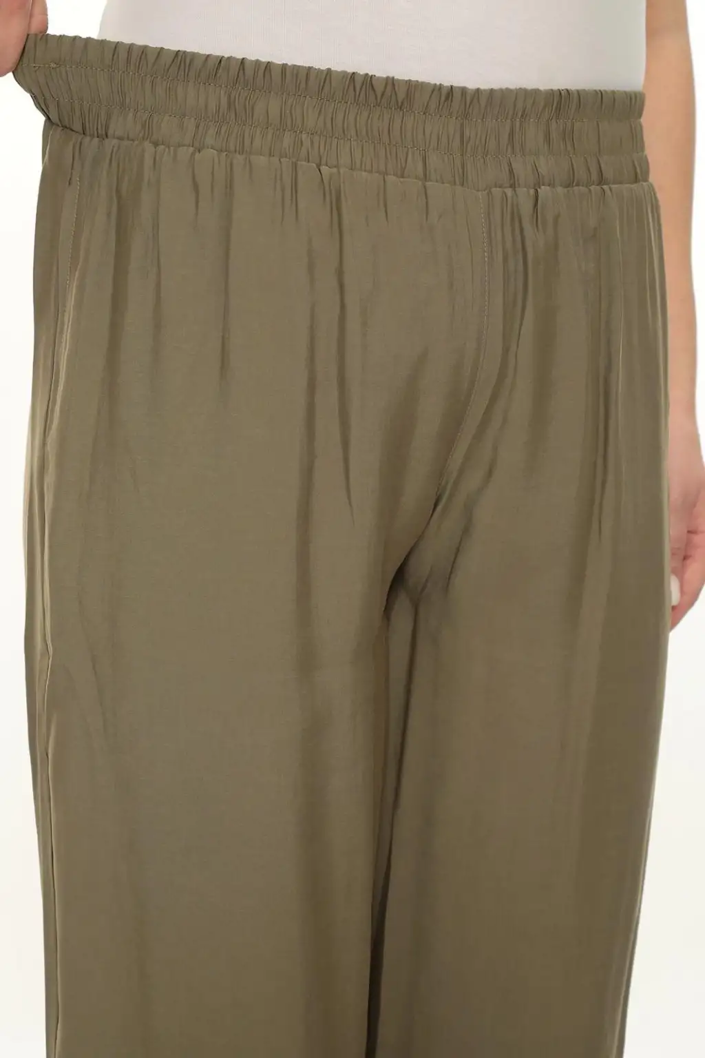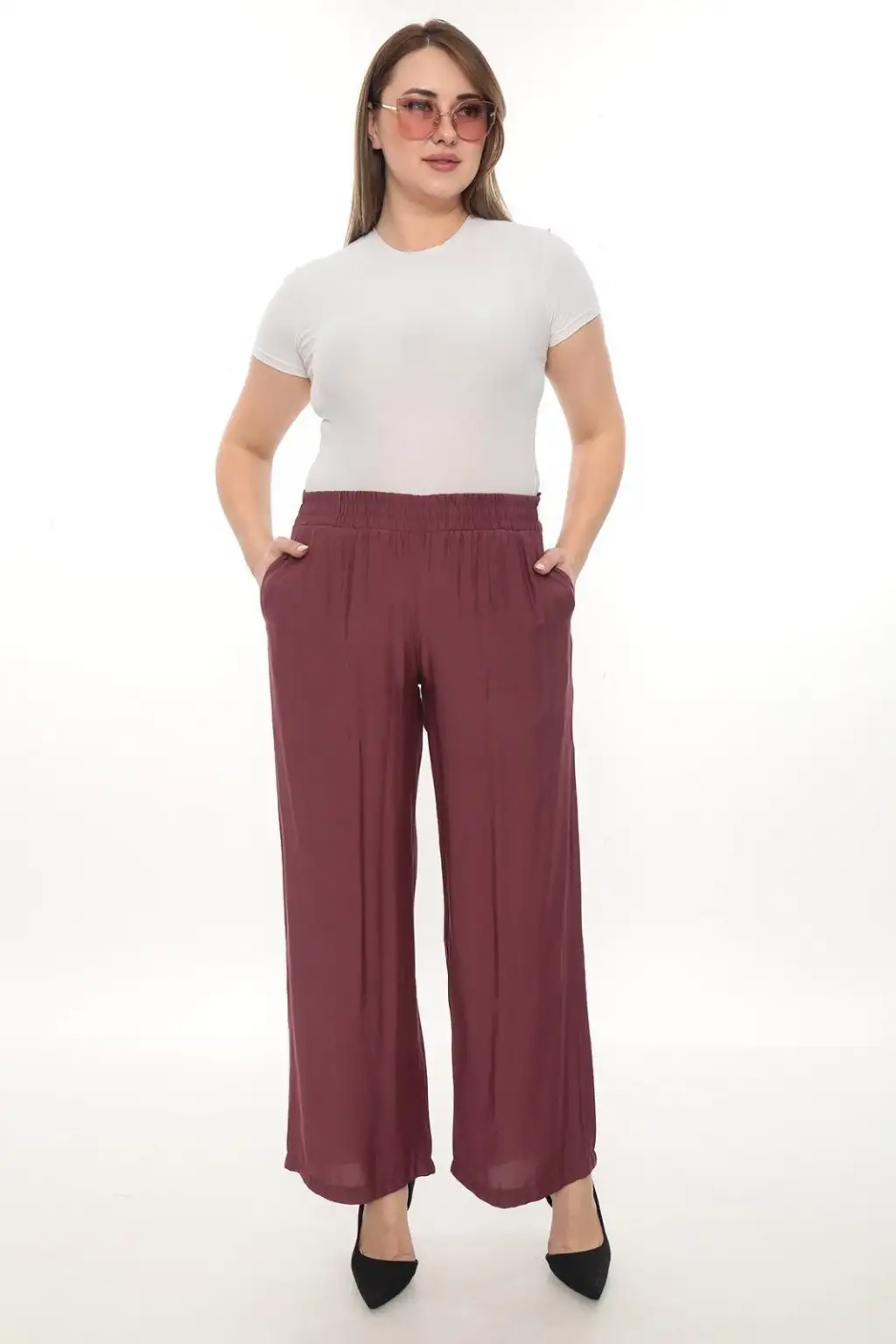 Esnek beli lastikli pantolon yapısı vücuda uyum sağlar ve kolay kullanım sunar. Hafif ve dökümlü kumaşı sayesinde hareket özgürlüğü sağlar. Rahat kesim kadın pantolon modeli; tişört, gömlek, tunik ve bluzlarla kolayca kombinlenebilir.