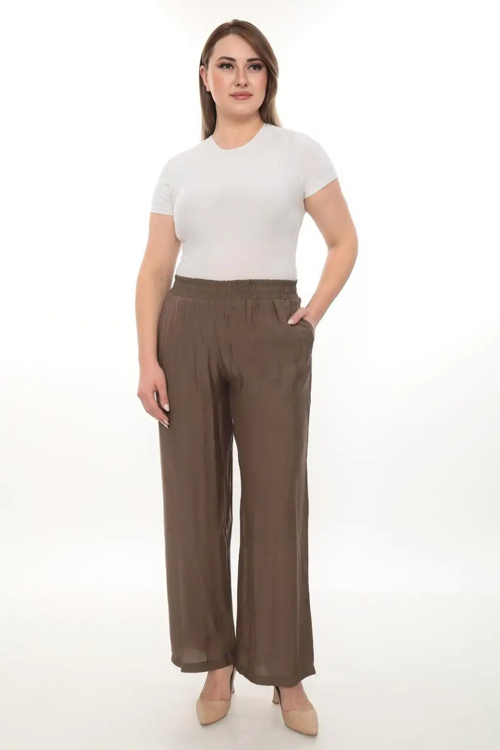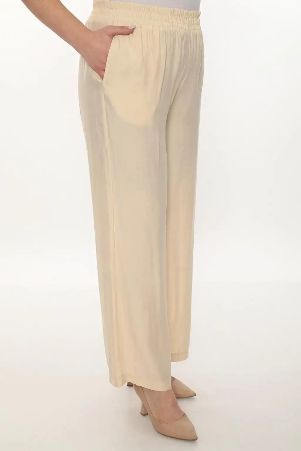 Günlük kombinlerin vazgeçilmez parçası olacak kadın beli lastikli pantolon, rahat kesimi ve akıcı kumaşı ile gün boyu konfor sağlar. Modern ve sade tasarımı sayesinde hem günlük kullanımda hem de ofis stilinde şık bir görünüm oluşturur.