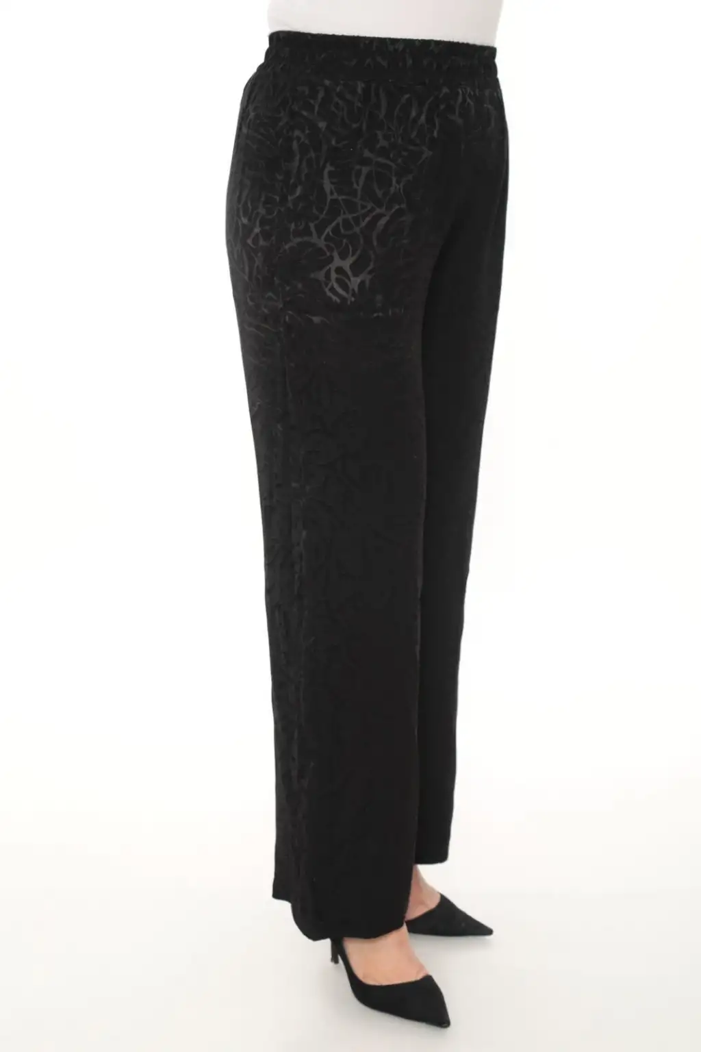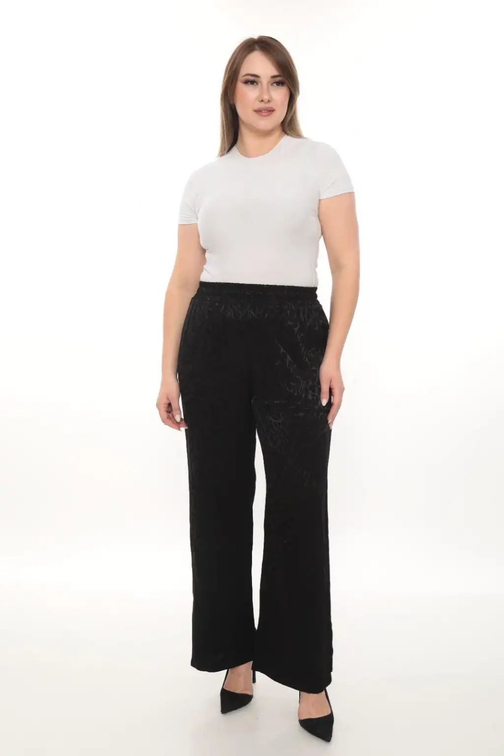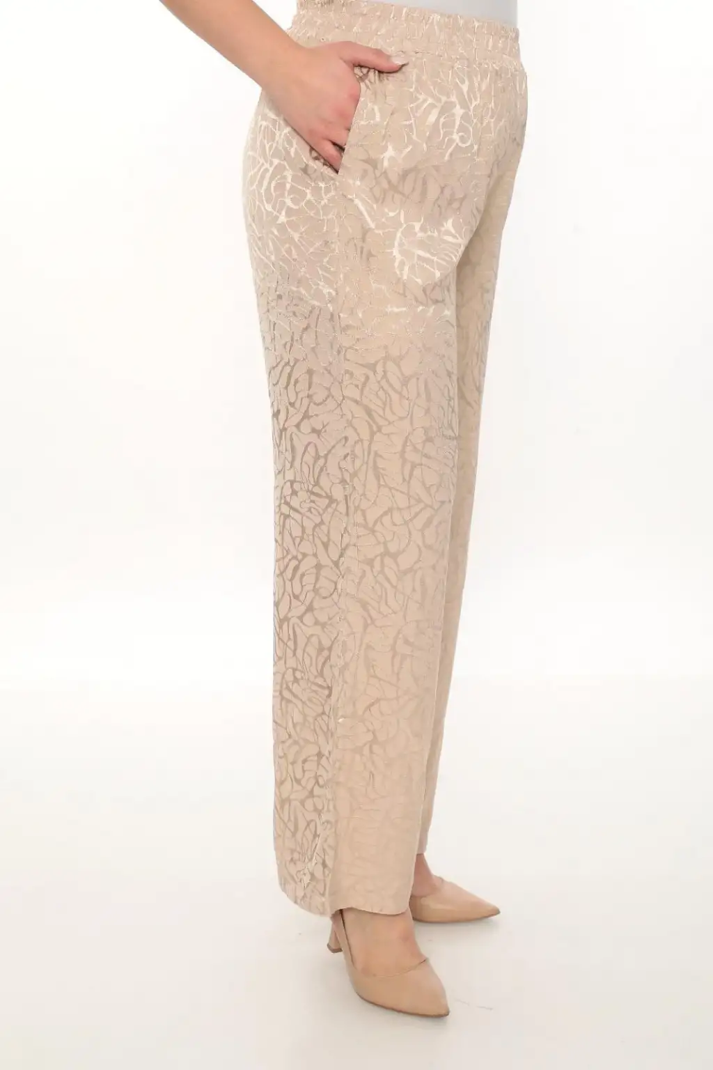 Esnek beli lastikli pantolon yapısı vücuda uyum sağlar ve kolay kullanım sunar. Hafif ve dökümlü kumaşı sayesinde hareket özgürlüğü sağlar. Rahat kesim kadın pantolon modeli; tişört, gömlek, tunik ve bluzlarla kolayca kombinlenebilir.