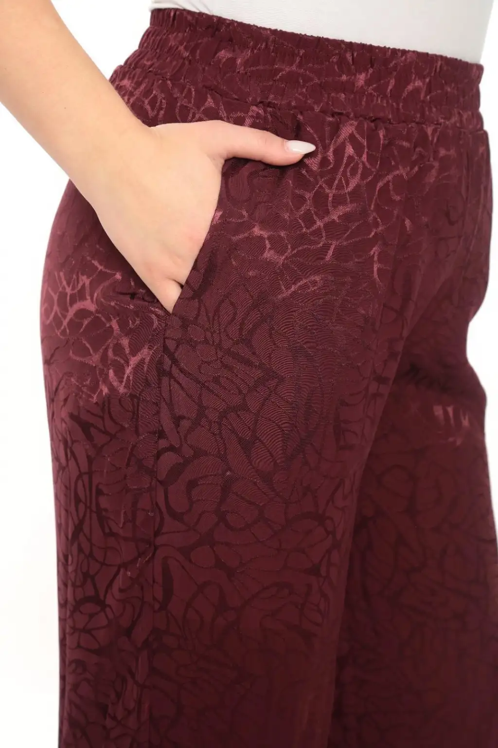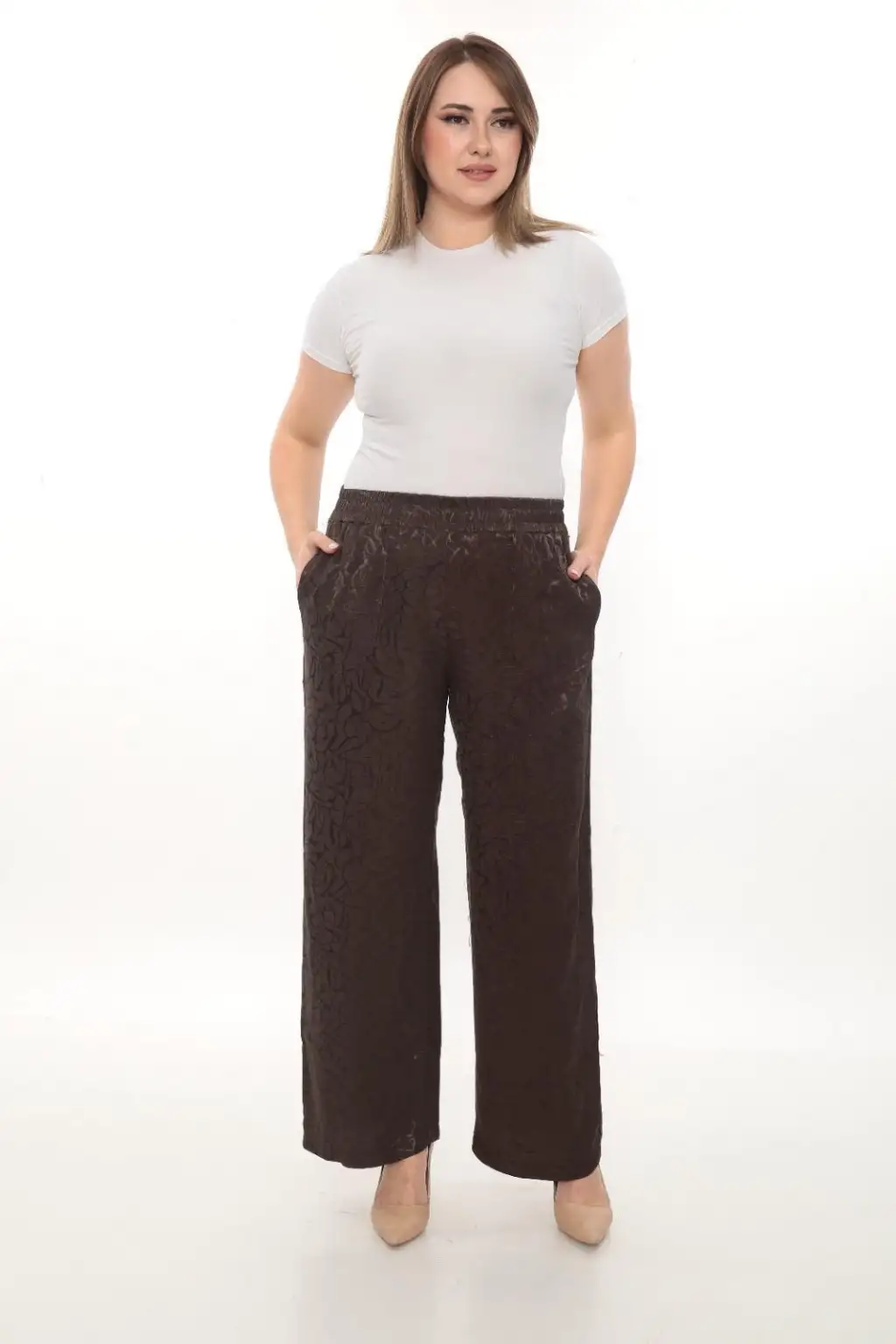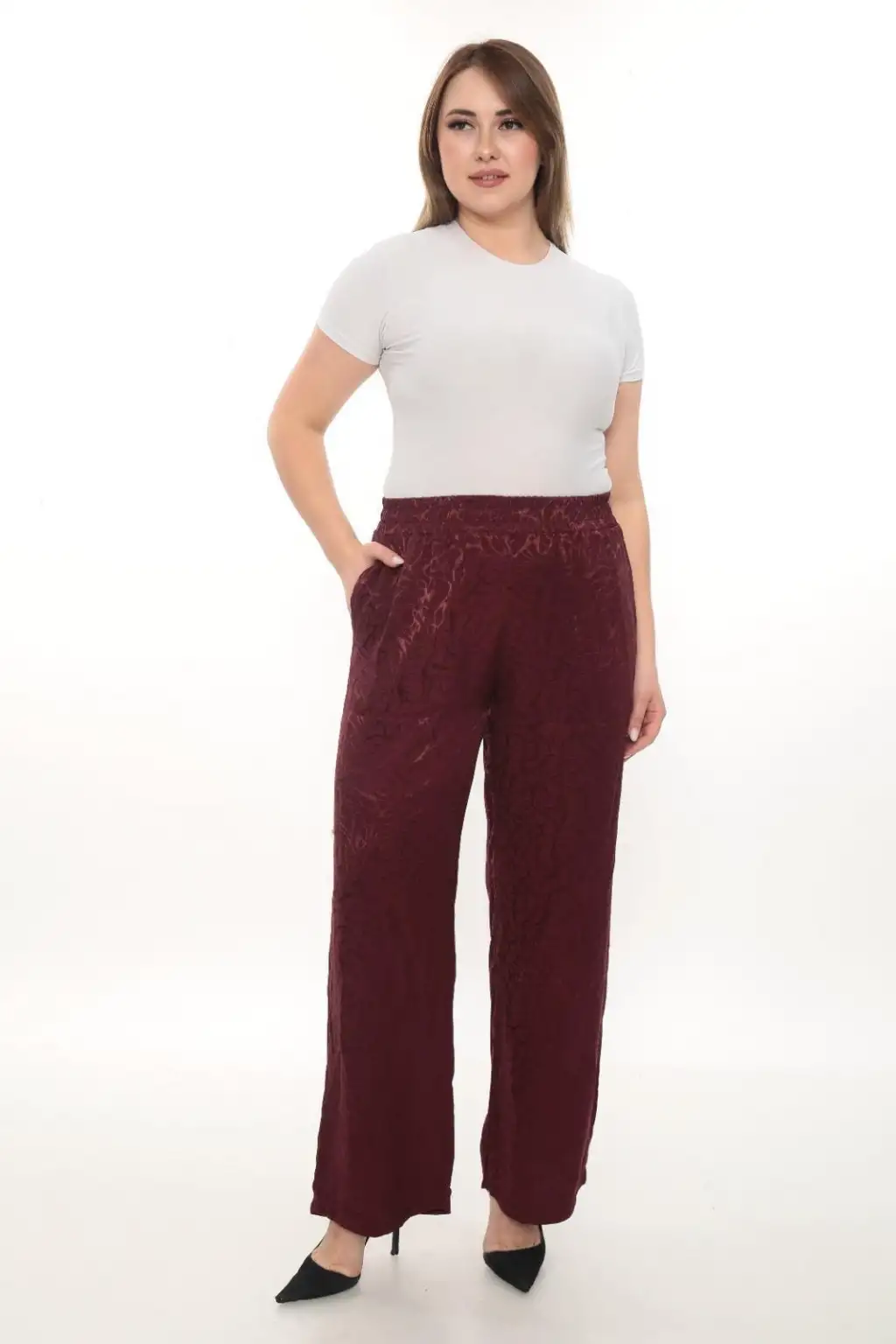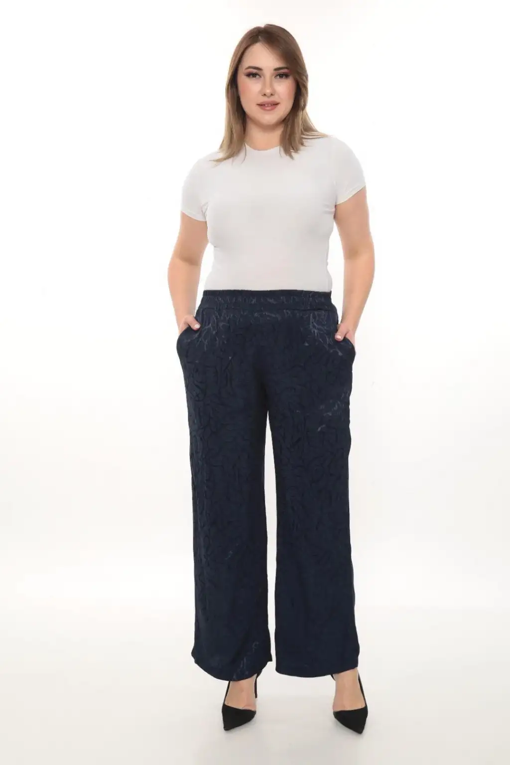 Esnek beli lastikli pantolon yapısı vücuda uyum sağlar ve kolay kullanım sunar. Hafif ve dökümlü kumaşı sayesinde hareket özgürlüğü sağlar. Rahat kesim kadın pantolon modeli; tişört, gömlek, tunik ve bluzlarla kolayca kombinlenebilir.